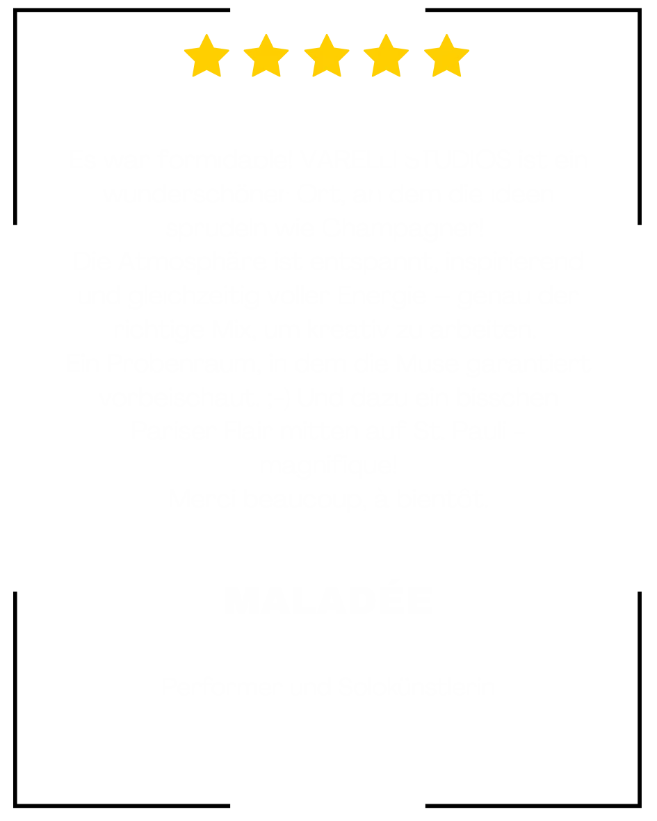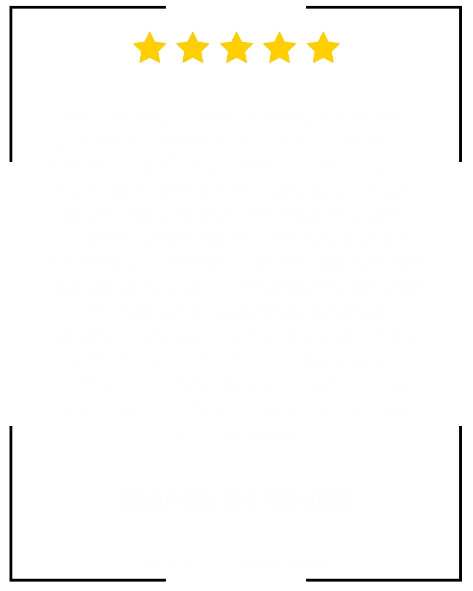 Ich bin Silvia Varelli, Regie-Choreografin und Gründerin der VARELLI STUDIOS. Nach über 14 Jahren kreativer Arbeit in genau diesen Räumen wollte ich einen Ort bewahren, der mich selbst geprägt hat. Die Studios sind meine Liebeserklärung an die Kunst, an Hamburg und an all jene, die mutig erschaffen, erforschen und träumen.